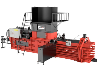 Центр по переработке металла использует мощный горизонтальный пресс-подборщик для алюминиевых банок и легких листового металла. Пресс-подборщик сжимает металлы в однородные, плотные блоки, пригодные для автоматической подачи в измельчители, что повышает эффективность и безопасность на рабочем месте.